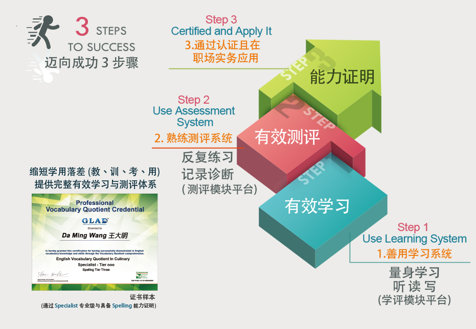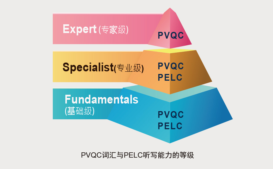 专业英文字词汇能力是由 Global Learning and Assessment Development (GLAD) 全球学习与测评发展中心,礼聘各专业领域的专家共同指导研发而成。针对各个专业领域,在专业工作上的沟通、阅读问题,最关键的、经常使用的专业字词做整理,结合技职教育学习理论与现代化云端网络及信息科技,提供给各专业领域的专业人员或大学研究生、技职院校师生,作为学习专业英语的有效体系与平台。PVQC 内采用了合作的专家所提供的杜卡斯®技能式学习机制技术 ,让在职场工作者或职业教育的学习者,有效的学会行业英文的看听说写(RLSS)能力,能直接反应的张口说专业英语的关键词汇,是奠定学习者专业英文听写能力的重要秘诀。
