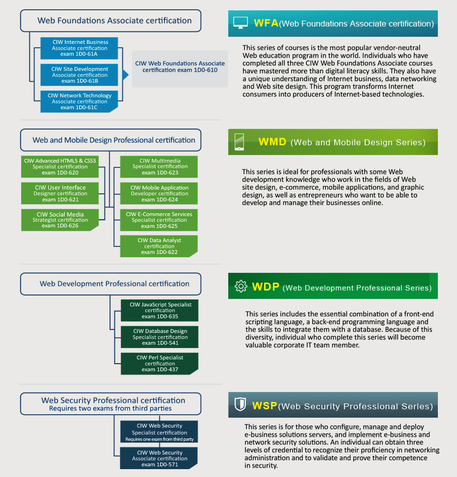 CIW comprises the world's fastest growing vendor-neutral Web technology education and certification programs for professionals. CIW is the industry standards for web technology education and certifications. CIW certification program provides exams for web foundation series, web design series, web and mobile design series, web development series and web security series. CIW Chinese exams are available now through GLAD’s partners in Greater China.
