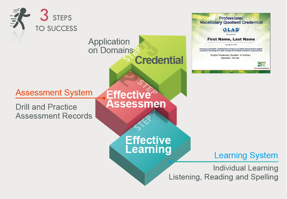 Key words and terminologies are the KSF (key success factors) needed for students or job-seekers to enter a new domain or workplace. The Professional Vocabulary Quotient Credential (PVQC) program provides about 500 to 2,000 key words and terminologies in English (L2) and native language (L1) for every domain or industry; such as culinary, medical and nursing, hospitality, automobile, ICT(Information and Communication Technology), electrical and electronic industry, etc.